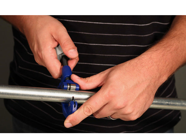 Use a tape measure and marker to mark the desired length on the pipes you're cutting. You can use specialized tools to cut, but you don't have to! Our metal pipe and tube cutter works great and makes clean cuts. Simply line up the cutter wheel on the pipe where it is marked. Tighten the cutter until the wheel is touching the mark. Then start rotating the tool around the pipe while tightening it every few turns. Keep rotating and tightening until the pipe is cut. Each tool has a built in accessory to de-burr the pipe. Pop it out and rotate it around the exposed end to remove any burrs that formed. One thing to remember when measuring is the connector length may affect your needed pipe length. Check out the video for more details and a diagram.
