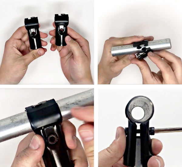 Our most popular item is the T Connector which is made of two identical halves that clamp down onto the pipes and provide a secure connection. The “puzzle piece” design allow the two pieces to lock together around one of the pipes. The hole and surrounding pocket, holds the nut in place (no need for a wrench), while the bolt is threaded from the other side. Insert the other pipe into the connector, tighten the bolt firmly with the hex wrench, and you are done!