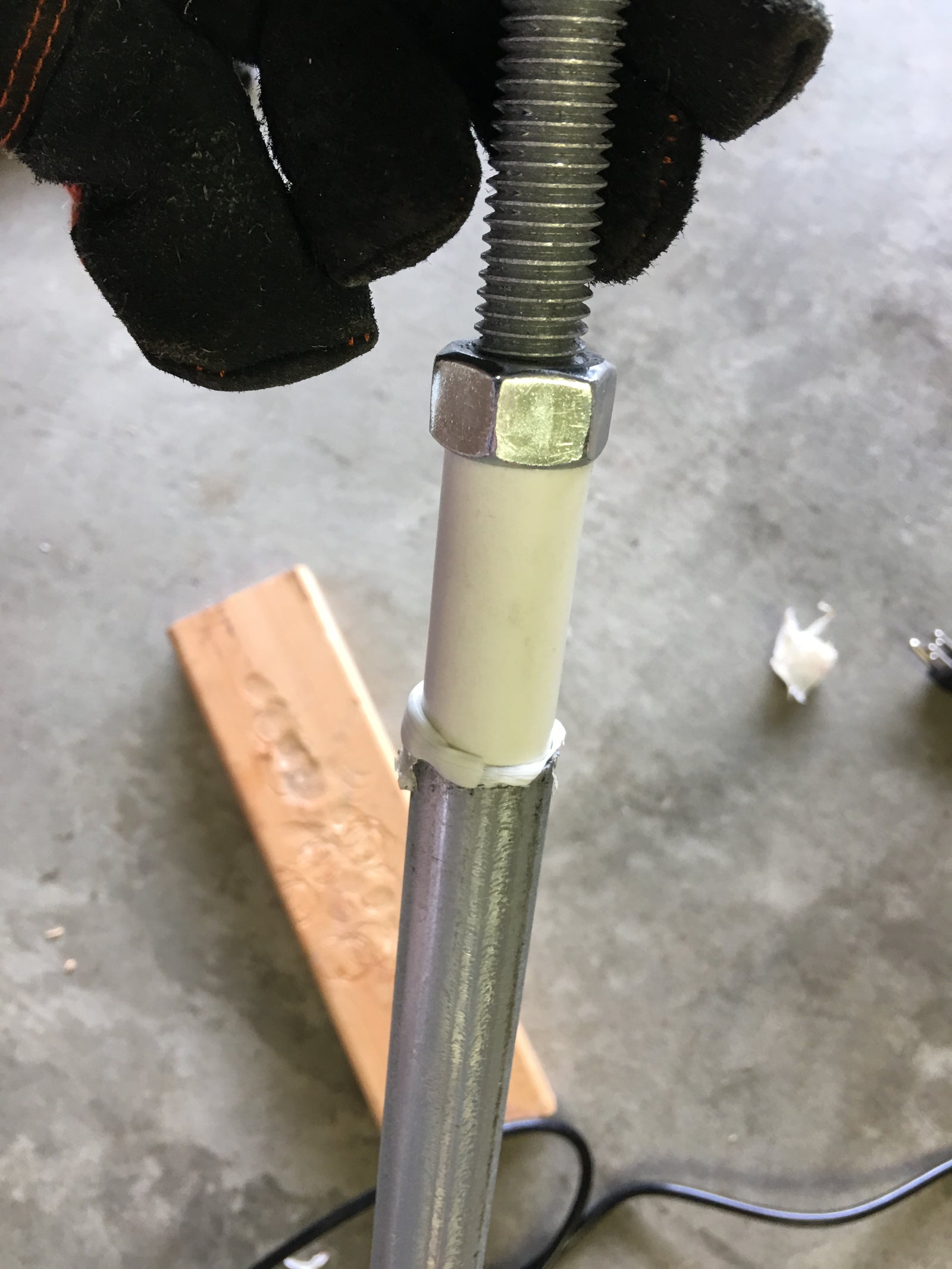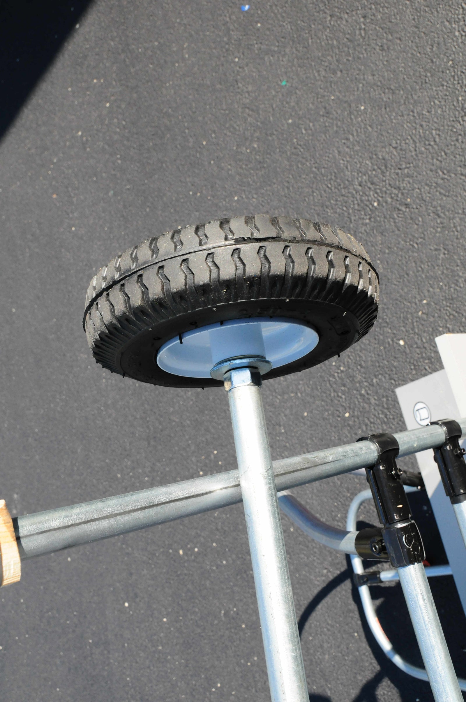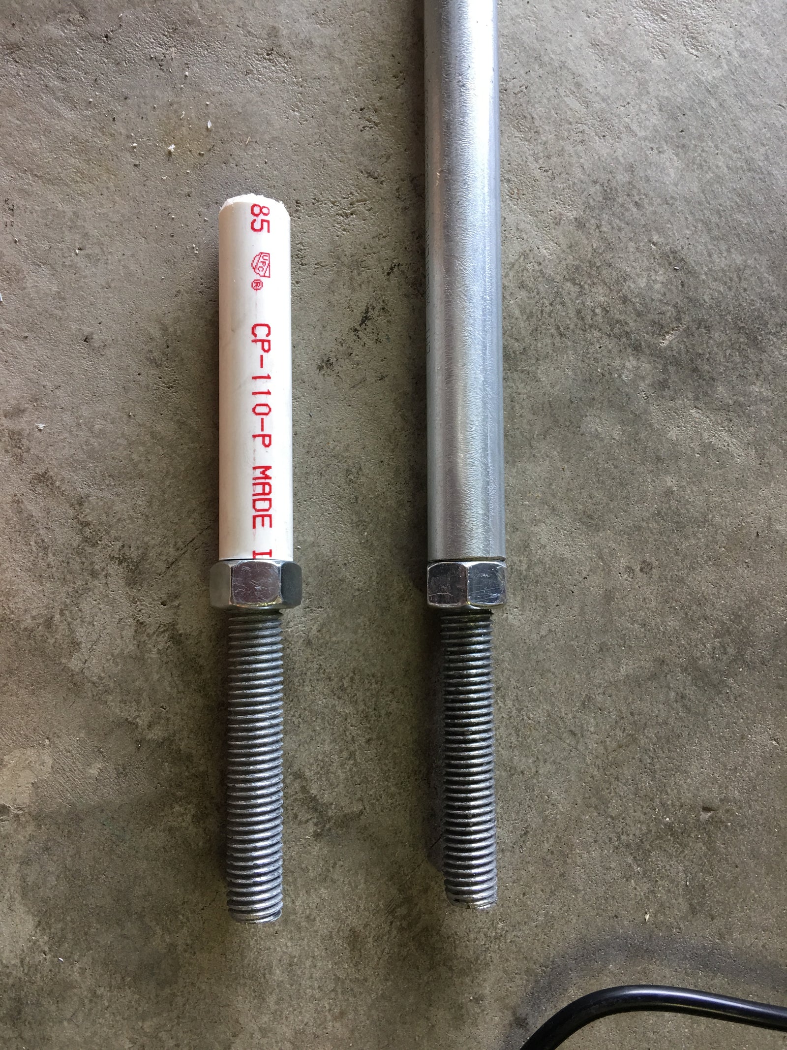 The wheels were done by putting threaded rod all the way through the conduit to act as an axle. They used PVC pipe as a bushing in between the threaded rod and inside diameter of the electrical conduit. This looks to be a great approach and would work for many different types of builds. Threaded rod like this can be purchased from your local hardware store. They also used two nuts on the outside of the wheel, which is a common way of locking them into position.